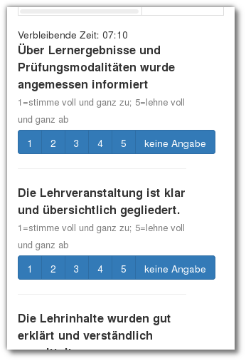 Nachdem die Evaluierungskriterien festgelegt wurden, kann die Codeliste mit den Zugangscodes generiert und an die Studierenden verteilt werden. Sobald diese den Code anwenden, steht ihnen eine begrenzte Zeit zur Verfügung, um die Umfrage auszufüllen.