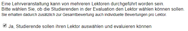 Nur wenn die Checkbox gesetzt wird, kann der Studierende in der LV-Evaluierung über ein extra angezeigtes Drowdown-Menü den eigenen Lektoren auswählen.