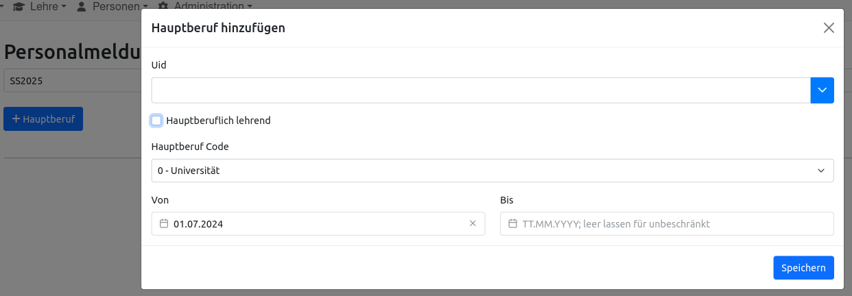 Hier können die zu meldeten Hauptberufdaten für ein Jahr (markiert durch das abschließende Studiensemester) angezeigt und verändert werden. Dies betrifft die Information, ob MitarbeiterInnen hauptberuflich lehrend sind oder die Lehrtätigkeit nur ein Nebenberuf ist. Bei nebenberuflich Lehrenden muss der Hauptberuf (mittels Code) angegeben werden.