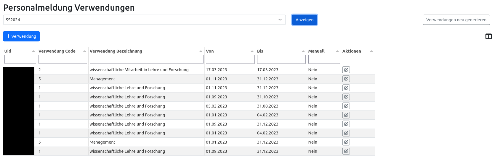 Die „Verwendungen“ Oberfläche ermöglicht das Anzeigen aller in FH Complete gespeicherten Verwendungen für ein Jahr (markiert durch das abschließende Studiensemester). Ferner können die Verwendungen wie unter Generieren der Verwendungen beschrieben generiert und wie unter Manuelles Festlegen der Verwendungen beschrieben manuell hinzugefügt und verändert werden.