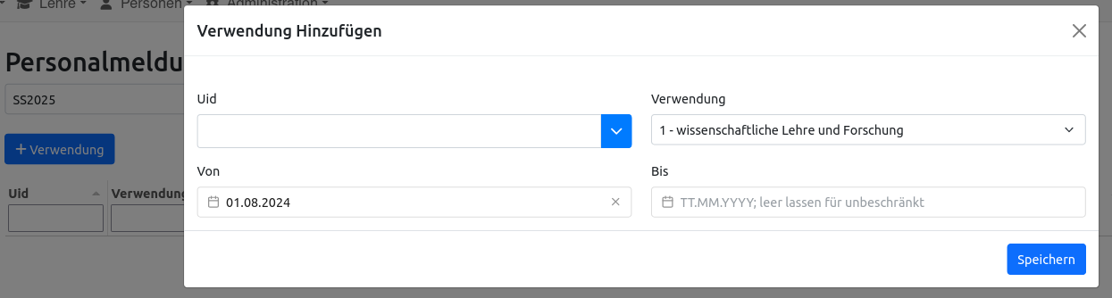 Wenn ein automatisiertes Generieren der Verwendungen nicht möglich ist, oder eine Berichtigung der generierten Verwendungen notwendig ist, können Verwendungen auch manuell geändert oder hinzugefügt werden. Hierzu wird der Menüpunkt BIS-Personalmeldung Verwendungen verwendet.
