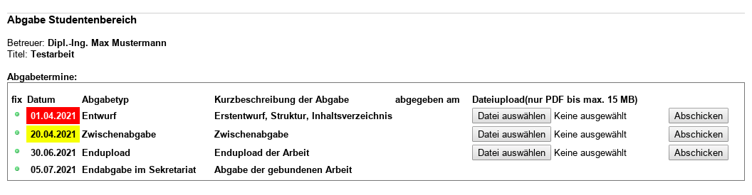 Im Bereich Abgabetermine werden die verfügbaren Termine (Erstentwurf, Zwischenabgabe, Endupload, …) mit Kurzbeschreibung gelistet.