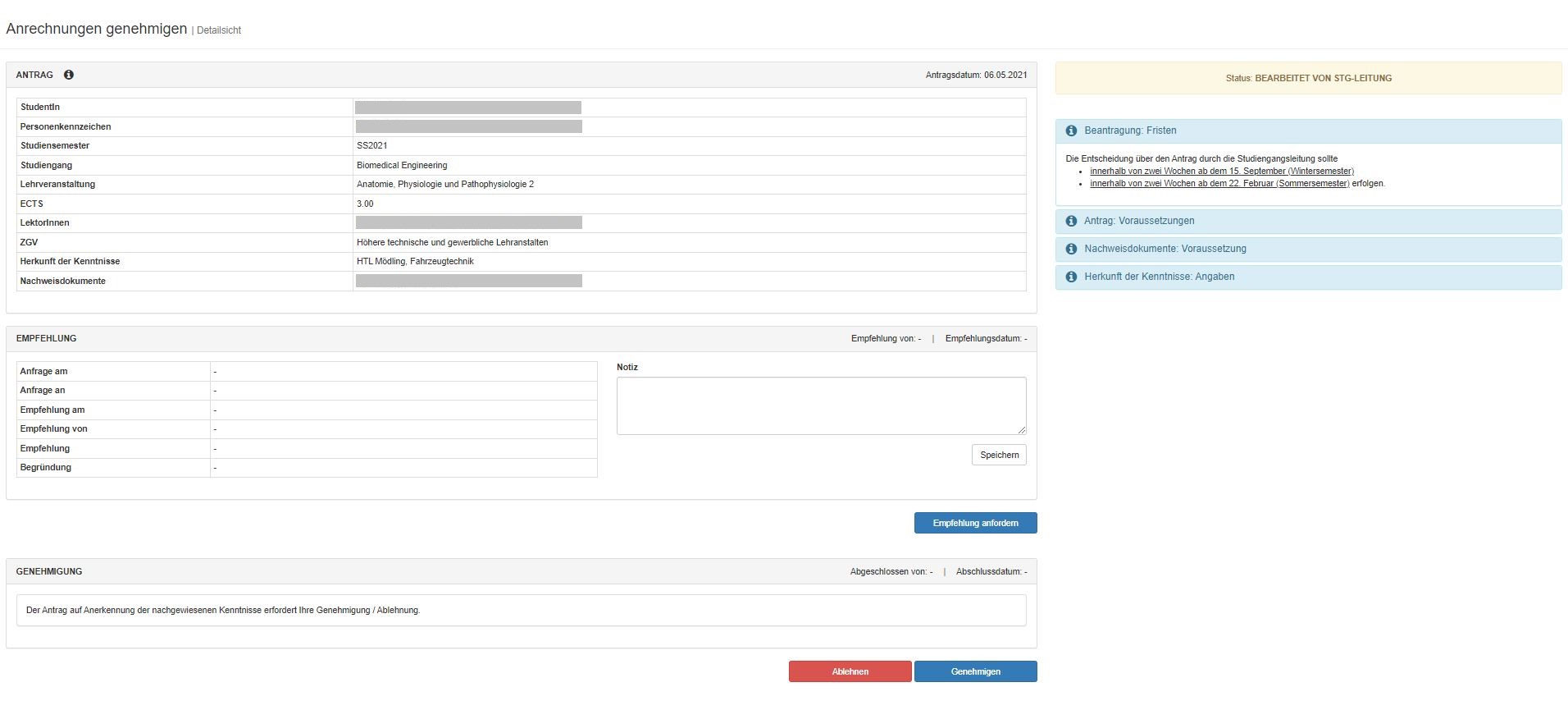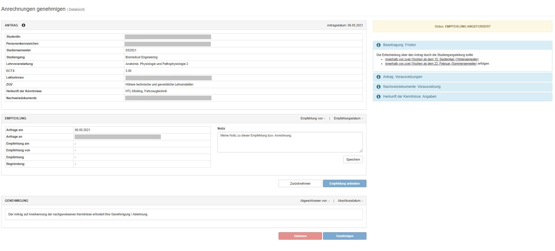 Die Studiengangsleitung kann über die Anträge selbst entscheiden oder eine Empfehlung bei der LV-verantwortlichen Person anfordern. (LV-Leitung oder, falls keine LV Leitung hinterlegt ist, alle der LV zugeordneten LektorInnen)