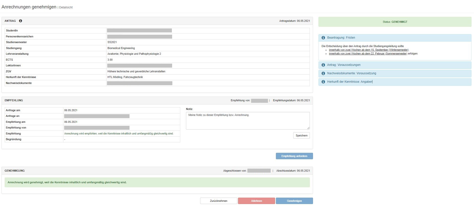 Genehmigen: Stattgeben des Antrags, weil die Kenntnisse inhaltlich und umfangmäßig gleichwertig sind. Klicken Sie auf den Button „Bestätigen“.