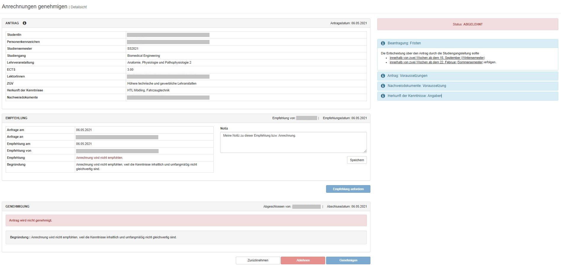 • Die ablehnende Entscheidung bitte im Notizfeld kurz begründen(z.B. Ablehnung aus formalen Gründen; Ablehnung, weil Vorkenntnisse inhaltlich und / oder umfangmäßig nicht gleichwertig sind…).
