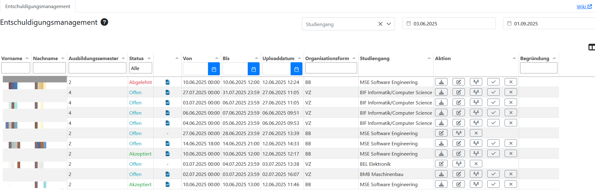 • Entschuldigungen prüfen: Studierende laden Entschuldigungen hoch, Admins können sie downloaden und akzeptieren oder ablehnen. Ablehnungen benötigen eine Begründung.