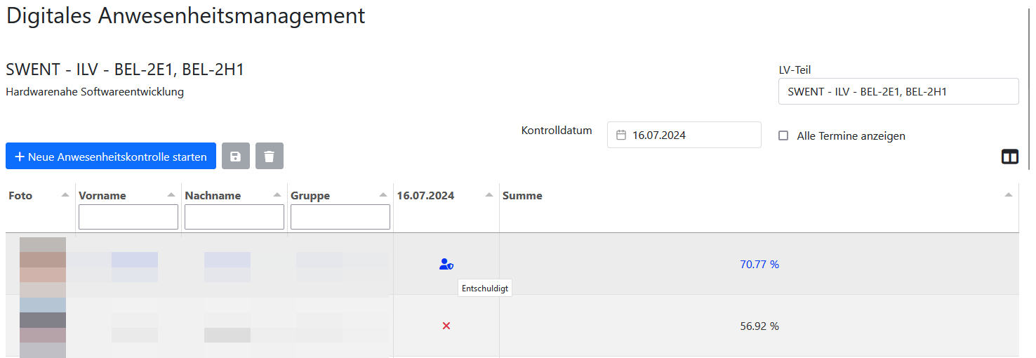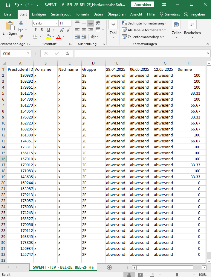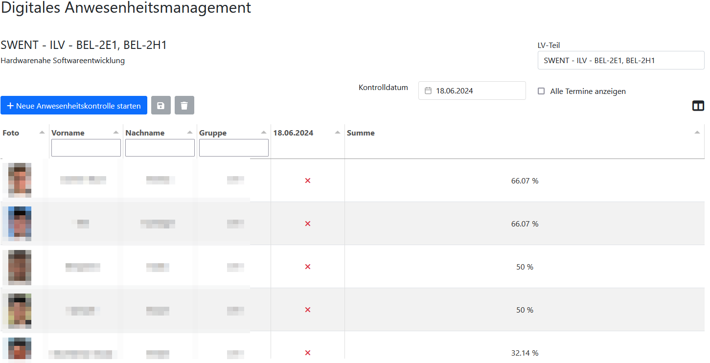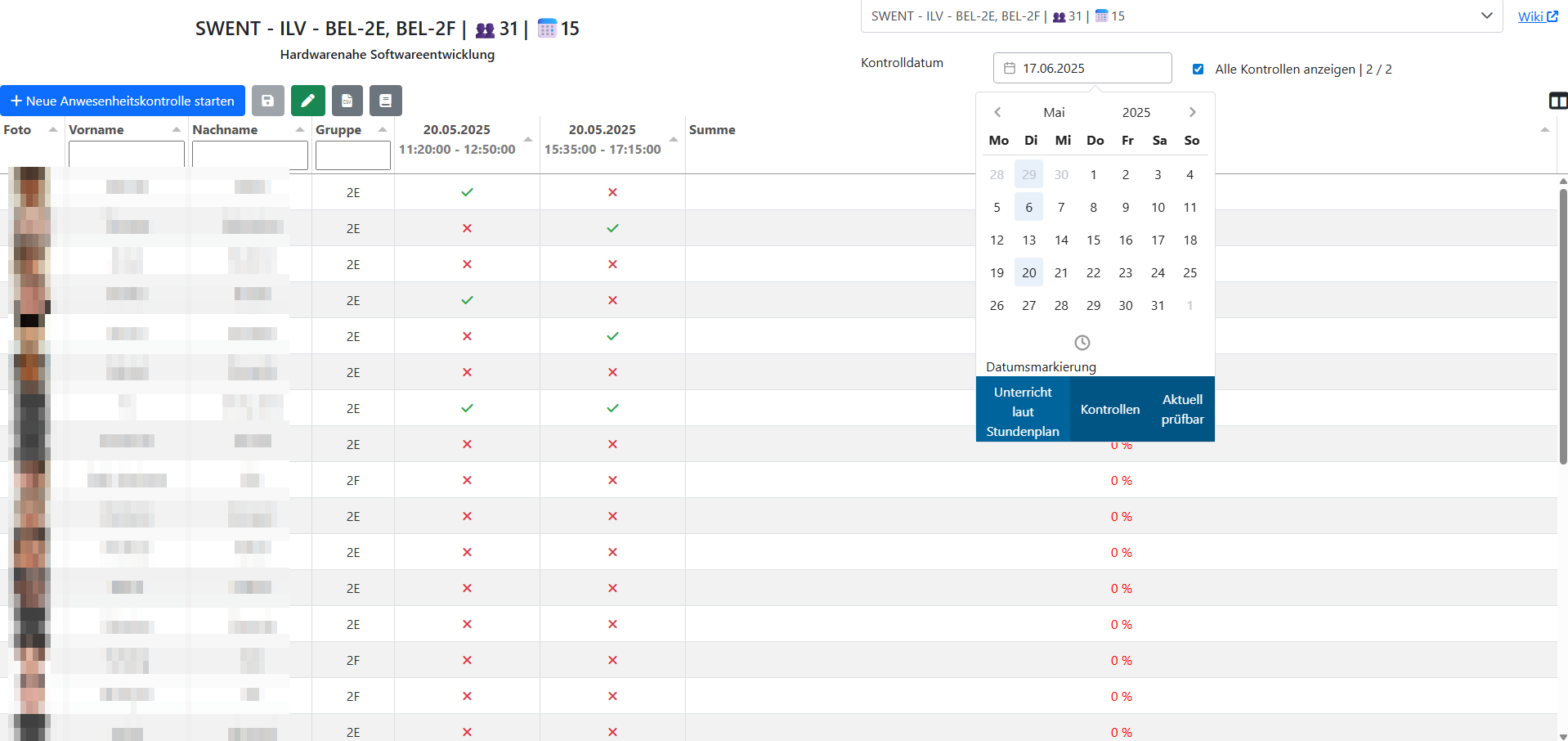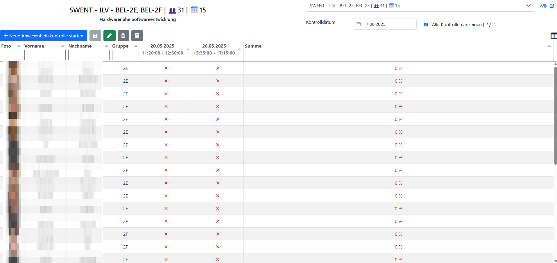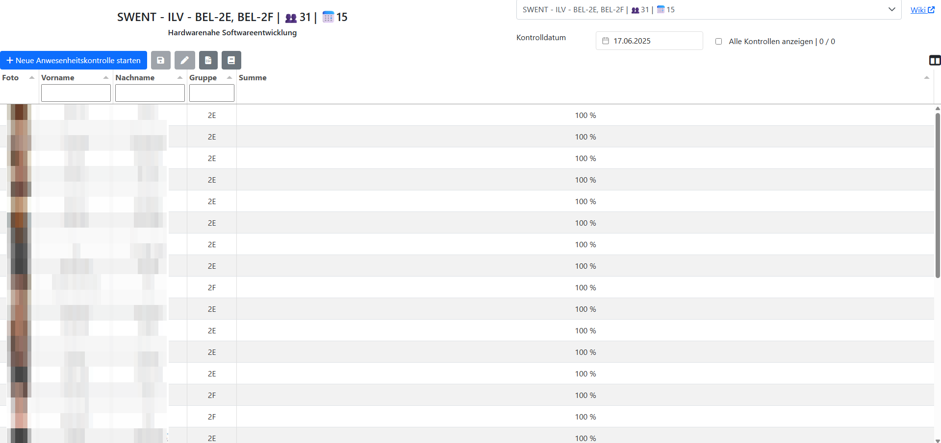 Nachdem Sie die Kontrolle beenden, wird diese als aktuelle Spalte angezeigt, sowie die neue Anwesenheitsquote der jeweiligen Studierenden berechnet.