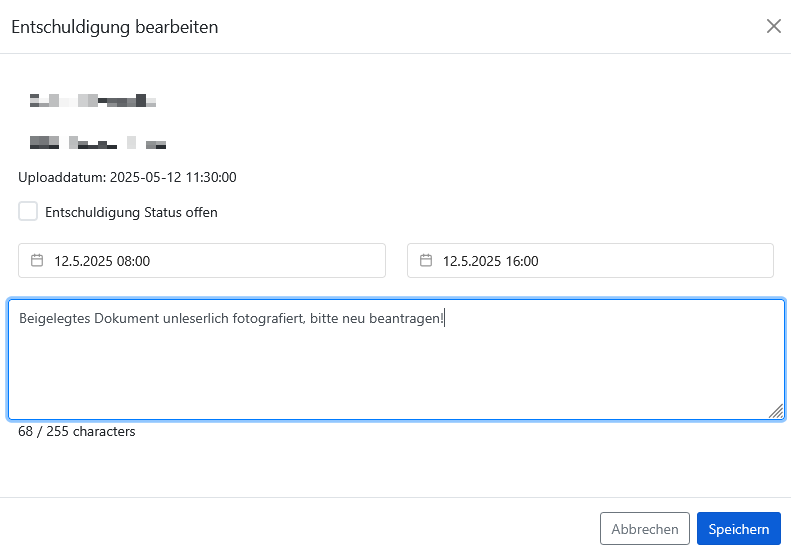 In der Entschuldigungsverwaltung können für Anträge mit offenem Status neue Datumswerte angegeben werden, außerdem steht eine Textarea Komponente bereit um längere Notizen/Begründungen angeben zu können!