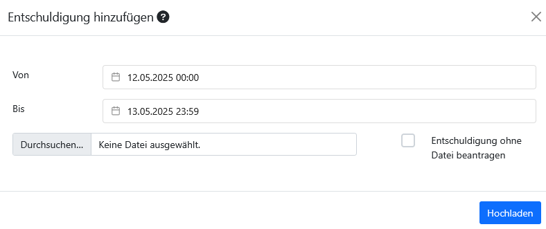 Im Tab „Entschuldigungen“ können Studierende über den Button „Entschuldigung hochladen“ eine Datei(.pdf, .jpg, .png) mit zugehöriger Zeitspanne (bis zu 5 Werktage in die Vergangenheit) hochladen.