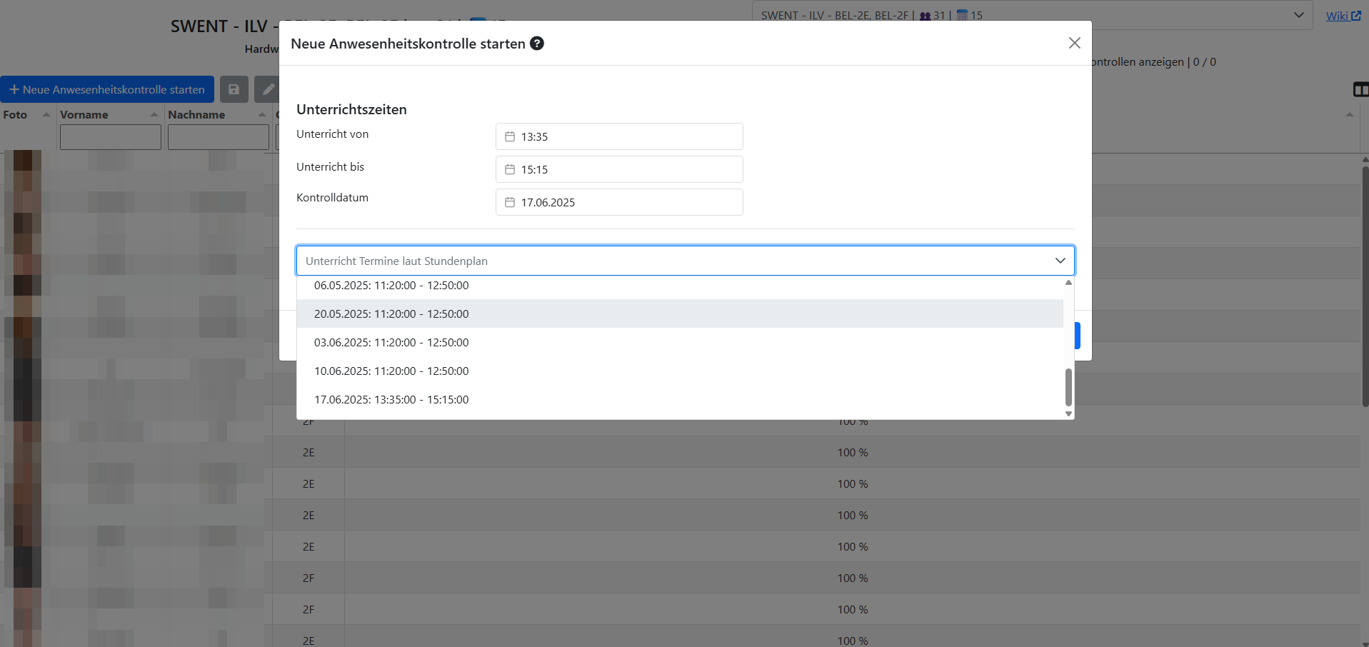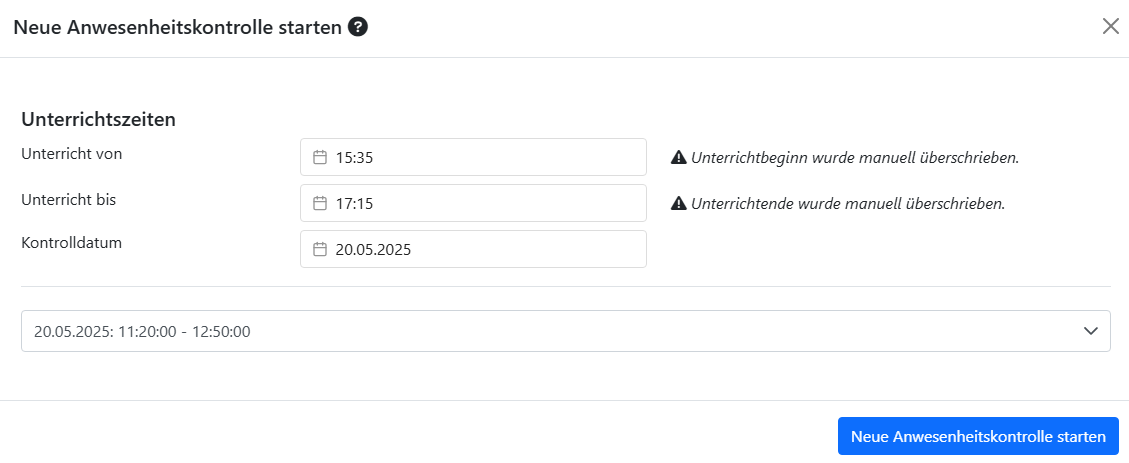 Über Klick auf den Button „Neue Anwesenheitskontrolle starten“ können Unterrichtskräfte Beginnzeit, Endzeit, sowie das Datum ihrer Kontrolle wählen. Diese Werte können auch aus den Einträgen welche aus dem LV-Plan geladen werden gewählt werden, sind jedoch nicht an diesen gebunden. Beginn und Ende der Kontrolle sollte mit dem Beginn und dem Ende des Unterrichts übereinstimmen, da von diesen Zeitspannen die Anwesenheitsquote der teilnehmenden Studierenden berechnet wird.