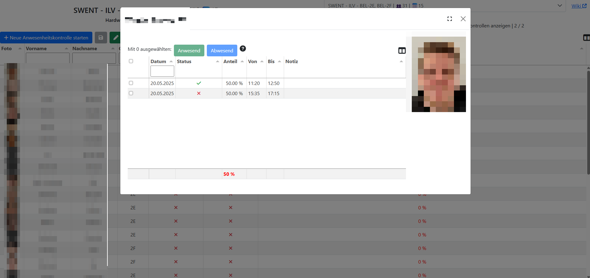 Sollte es Probleme mit der ordentlichen Durchführung der Anwesenheitskontrolle geben, können diese entweder in der Detailansicht eines jeden Studierenden durch Klick auf die jeweilige Tabellenzeile aufgerufen und bearbeitet werden. Sollten weitere interessante Informationen zu Studierenden und deren Verhalten vorkommen, können diese in der Notizspalte aufgezeichnet werden.