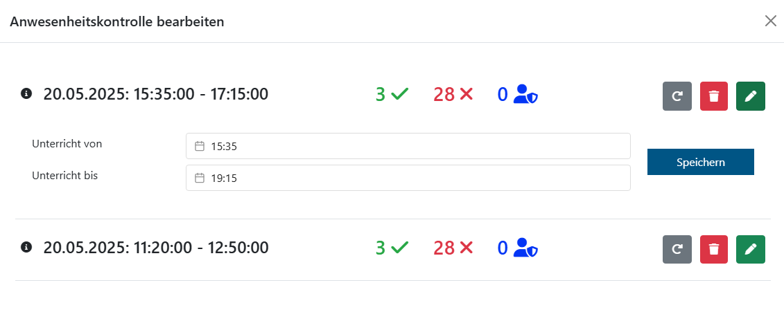 Sollte irrtümlich eine Kontrolle mit falschem Datum, Beginnzeit oder Endzeit gestartet worden sein können user mit dem Recht „extension/anw_r_lektor“ bis zu 1 Tag alte Kontrollen sowie deren zugehörigen Anwesenheitseinträge über den „Anwesenheitskontrolle bearbeiten“ Dialog löschen. Außerdem können Sie dort bestehende Kontrollen neu starten, sowie deren Gültigkeitszeiten editieren.