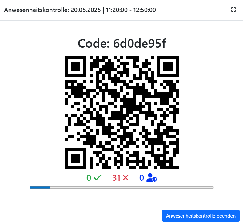 Die Anwesenheitskontrolle kann als Unterrichtender beliebig lange aktiv gehalten werden, um nach eigenem Ermessen den Kontrollzeitpunkt zu wählen, es erneuert sich jedoch nach einem kurzen Intervall der Zugangscode um vorzubeugen dass Studierende diesen an abwesende Teilnehmer weiterleiten. Sollten Sie die Datenqualität Ihrer Anwesenheitsquoten also streng nehmen, empfielt es sich die Kontrollen nicht zu lange und zu unterschiedlichen Zeiten im Unterricht durchzuführen.