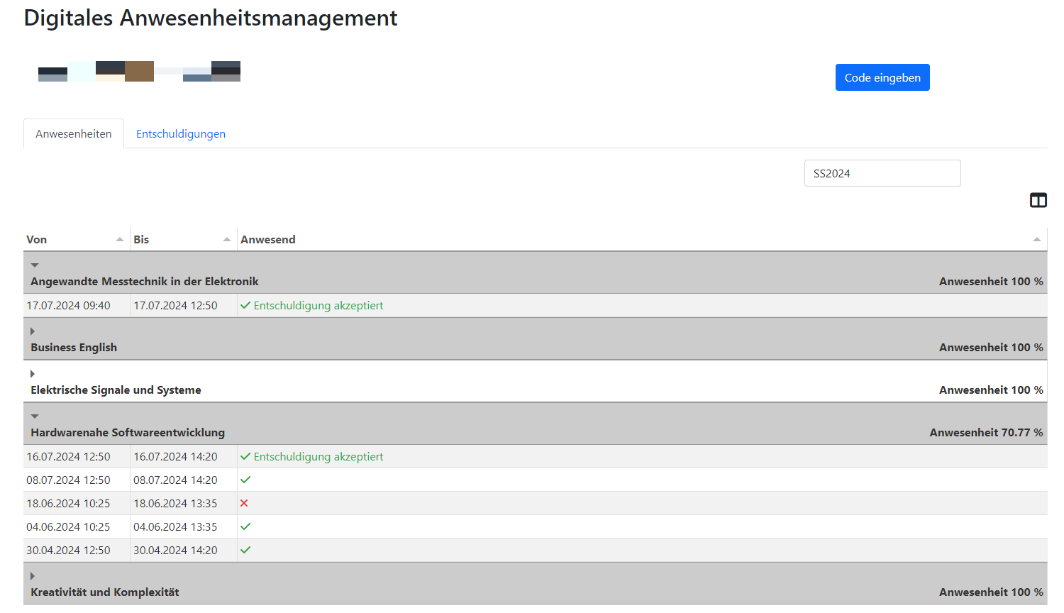 Übersicht: Studierende sehen ihre Anwesenheiten pro Semester und können Listen ein- und ausklappen.