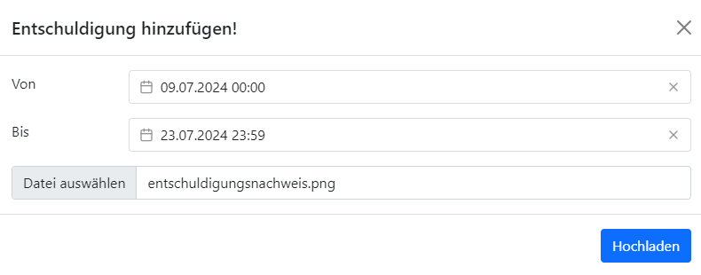 • Entschuldigungen: Über „Entschuldigung hochladen“ Dateien (PDF, JPG, PNG) mit Zeitraum einreichen.