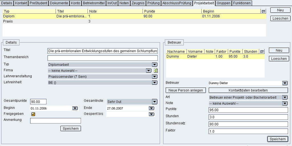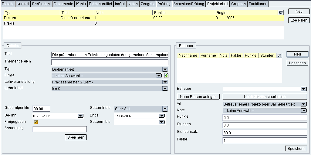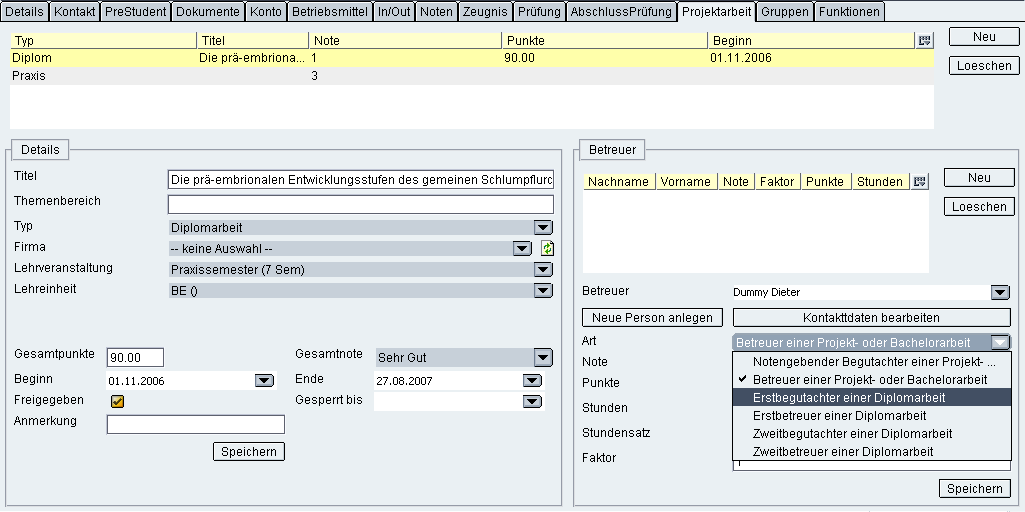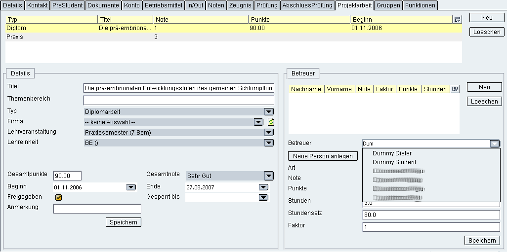 Um einer Projektarbeit eine/n BetreuerIn hinzuzufügen, muss zuallererst die betreffende Projektarbeit im Listenfenster markiert werden. Der Eingabevorgang wird per Klick auf Neu im Betreuer-Bereich rechts unten begonnen (Siehe Abbildung 16.8.) Anschließend werden die Daten der betreffenden Person eingegeben. Zur Auswahl des Namens sind, wie in Abbildung 16.9 dargestellt, mindestens drei Buchstaben des Familienamens in das Feld einzugeben. Per Klick auf die Pfeiltaste rechts neben dem Feld kann daraufhin die/der gewünschte BetreuerIn ausgewählt werden. Nachfolgend sind noch folgende Felder zu vervollständigen: