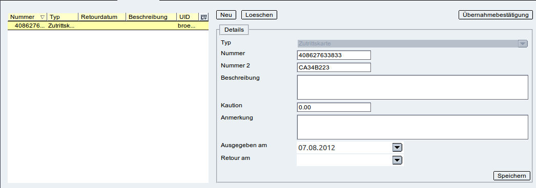 Button Übernahmebestätigung: generiert eine schriftliche Bestätigung (pdf) für die Übernahme des gewählten Betriebsmittels durch eine Person