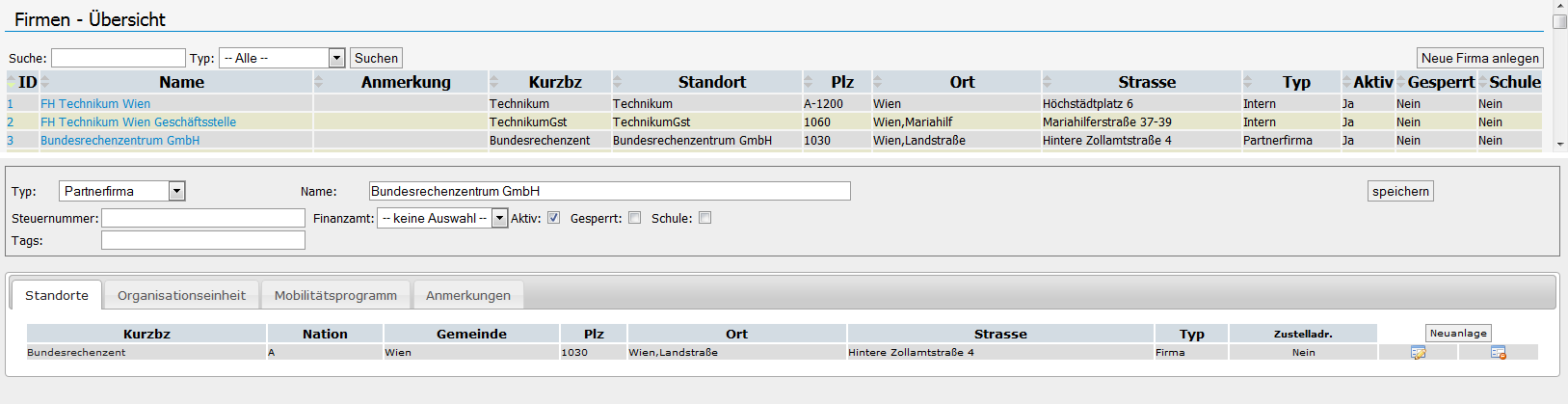 Unternehmensdaten werden grundsätzlich in VileSci verwaltet, die Oberfläche kann jedoch auch in FAS über den Menüpunkt Extras ⇒ Firmenverwaltung erreichbar. Hier werden sämtliche in FH Complete zur Verfügung stehenden Unternehmensinformationen administriert (z.B. für Lehraufträge, Projektarbeiten/Berufspraktika, Schulen für das PreInterressentInnen-Tool oder auch Erhalter-Standorte)