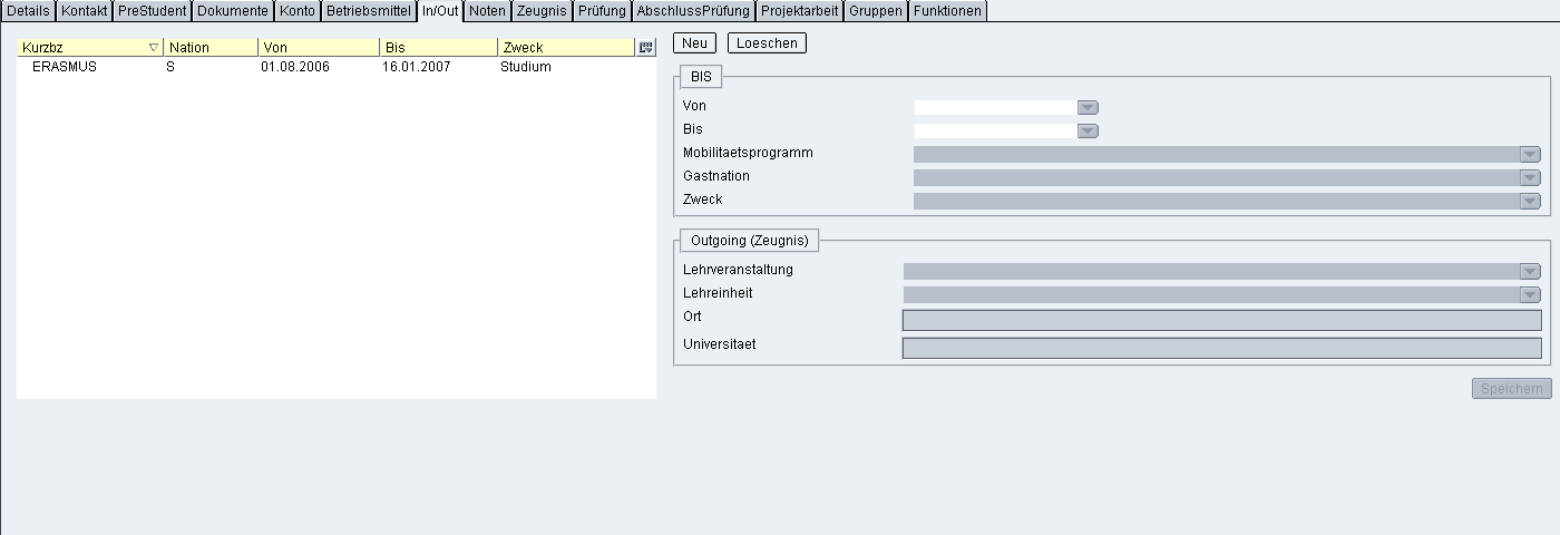 Anschließend werden zusätzlich die In/Out-Daten in der gleichnamigen Registerkarte des jeweiligen Studierendendatensatzes erfasst.