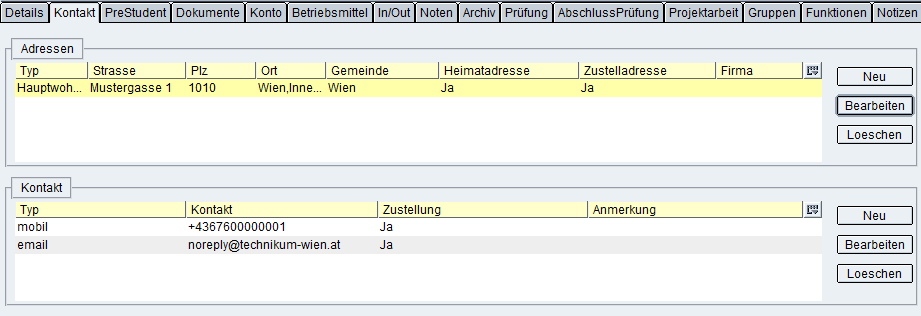 In dieser Registerkarte werden Kontaktinformationen der Studierenden erfasst: