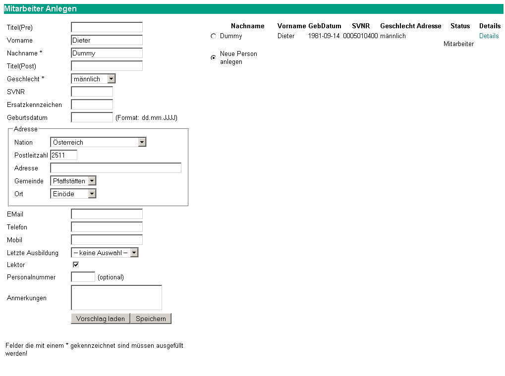 Um einen neuen Mitarbeiter anzulegen, muss entweder im Listenfeld 1 oder im Listenfeld 2 auf den Karteireiter Mitarbeiter geklickt und danach in der Menüleiste des Listenfeld 2 der Button Neu angeklickt werden. Dadurch öffnet sich, die in Abbildung 22.3 gezeigte Eingabemaske. Nach der Eingabe der Mitarbeiterdaten und einem Klick auf Vorschlag laden wird geprüft, ob diese Person bereits im System vorhanden ist. Wenn die gewünschte Person in der Liste aufscheint, klicken Sie auf den kleinen Kreis neben der Person. Andernfalls wählen Sie den Punkt Neue Person anlegen aus. Der Mitarbeiter wird danach mittels Speichern-Taste in die Datenbank übertragen.