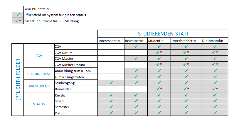 • ZGV: Zugangsvoraussetzungen, die zu einer Teilnahme an einem Diplom- oder Bachelor-Studiengang berechtigt. Schultyp und Datum des Abschlusszeugnisses sind Pflichtangaben für die BIS-Meldung.