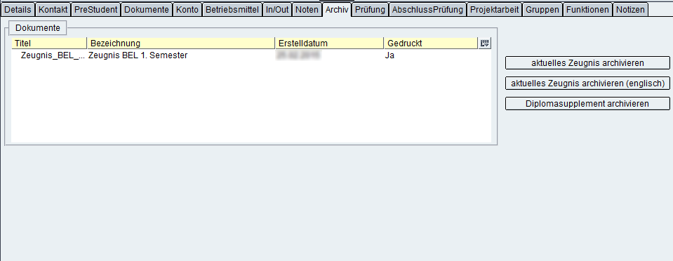 Mithilfe diese Registerkarte lassen sich Semesterzeugnisse für eine spätere Verwendung als pdf-Dokument ablegen. Hierzu ist im Vorfeld in das gewünschte Studiensemester zu wechseln und anschließend ein Studierenden-Datensatz im Hauptfenster auszuwählen. Per Klick auf aktuelles Zeugnis archivieren wird das Dokument erstellt und der entsprechende Eintrag im Bereich Dokumente angezeigt.