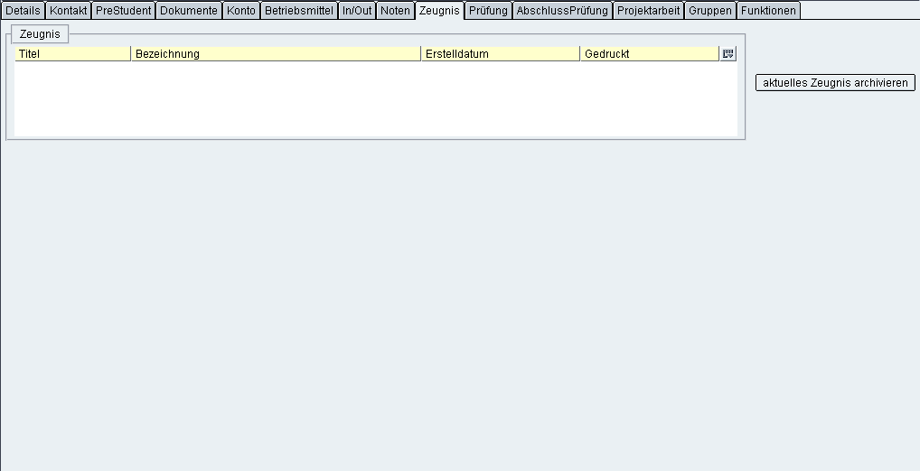 Die Karteikarte Zeugnis, wie in Abbildung 14.1 gezeigt, hat den Zweck Semesterzeugnisse für eine spätere Verwendung zu speichern. Dazu wird in das gewünschte Studiensemester gewechselt und der Student ausgwählt. Durch Klicken auf den Button Aktuelles Zeugnis archivieren wird das Zeugnis des ausgewählten Studenten im gewählten Studiensemester als Pdf-Datei erzeugt und gespeichtert. Nach Abschluss des Vorgangs wird das Zeugnis im Listenfeld mit bereits vorhandenen angezeigt. Mit einem Doppelklick wird eine Pdf-Datei geöffnet und kann dann gedruckt werden. Ein Rechtsklick bringt die Option das markierte Zeugnis zu löschen.