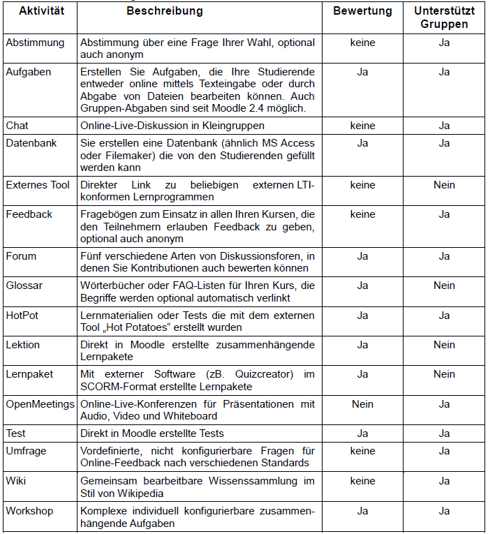 In der folgenden Tabelle sehen Sie eine Übersicht aller Aktivitäten die Sie in einem Moodle-Kurs anlegen können. Bewertet werden kann jeweils von einem Lektor oder Tutor. Aktivitäten die Gruppen unterstützen übernehmen standardmäßig die Gruppen-Einstellungen die Sie auf Kursebene getroffen haben, Sie können aber auch für jede diese Aktivitäten die Gruppen-Einstellungen separat ändern.