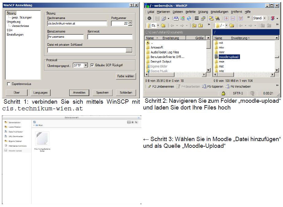 Dateien, die größer als 15MB können Sie mit einem SCP-Client (Tipp: „WinSCP“ ist Freeware) in den „Moodle-Upload“ Folder auf cis.technikum-wien.at hochladen und dann im Moodle über „Datei hinzufügen“ - „Moodle-Upload“ einbinden.