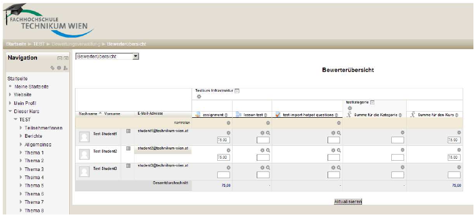 Um eine Übersicht aller Bewertungen in Ihrem Kurs anzuzeigen, wählen Sie in der linken Spalte unter „Kurs-Administration“ den Punkt „Bewertungen“, um zur in Abb.4 gezeigten Ansicht zu kommen.