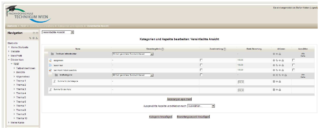 In Abb.5 sehen Sie die „Vereinfachte Ansicht“ für Kategorien und Aspekte. Über den Button „Kategorie hinzufügen“ können Sie eine neue Kategorie anlegen und die Berechnungsmethode für die Note wählen.