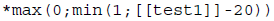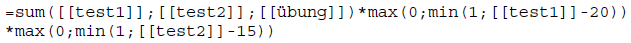 Diese Summe wird dann mit Faktoren multipliziert, die jeweils „0“ ergeben wenn die Punktezahl unter einem gewissen Wert (hier 20) liegt, und damit das Endergebnis unabhängig von der erreichten Punktezahl in anderen Aktivitäten immer auf 0 setzen.