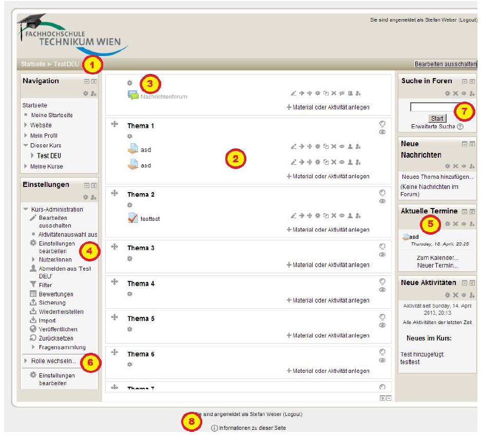In der rechten Spalte (5) Ihres Kurses gibt es eine Suchfunktion für Foren, und es werden die neuesten Aktivitäten und Nachrichten angezeigt. Außerdem können Sie dort noch eine Reihe von anderen Informationen als Blöcke hinzufügen wenn Sie im Bearbeitungsmodus sind.