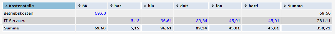 Abbildung 5.2 zeigt ein Beispiel einer solchen Auswertung. In den einzelnen Spalten sehen Sie alle, in der jeweiligen Kostenstelle verwendeten, Tags. Der Summenzeile können Sie dann mit einem Blick entnehmen, wieviele Ausgaben in Bestellungen mit dem entsprechenden Tag getätigt worden sind.